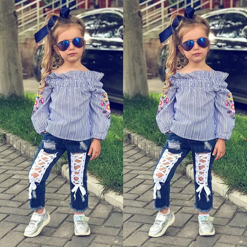 Special Price for Imcute 2020 Fashion Summer Autumn 2PCS Toddler Girls Kids Flower Off Shoulder Tops Denim Trousers J